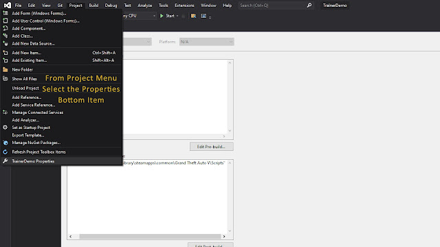 Then, from Build Events, add this line of code, replacing the path to your GTA 5 scripts folder. with your own: COPY "$(TargetPath)" "P:\SteamLibrary\steamapps\common\Grand Theft Auto V\Scripts"